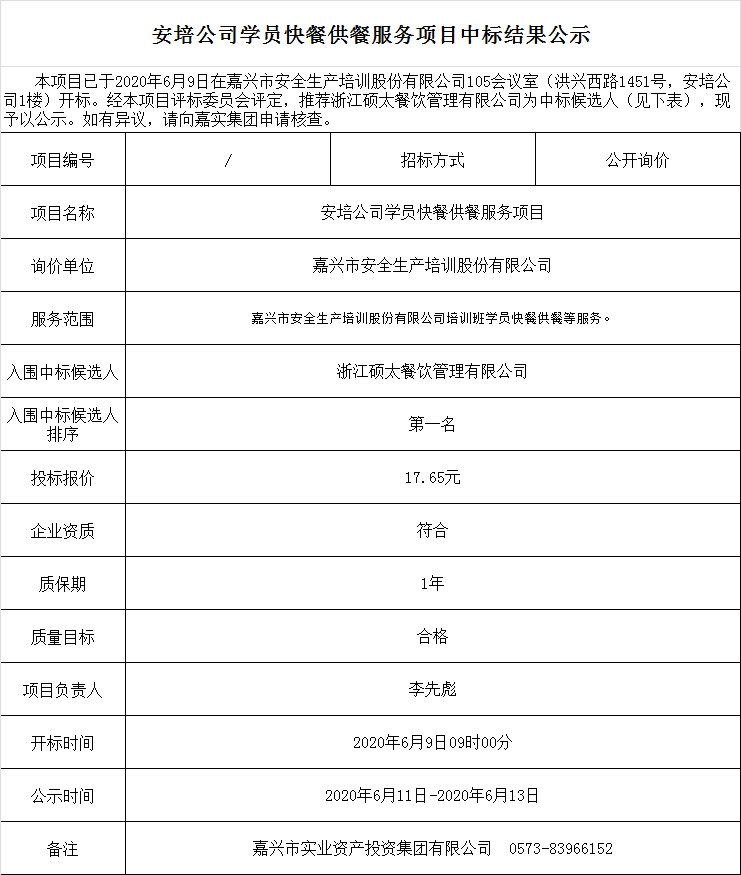 安培公司學(xué)員快餐供餐服務(wù)項目中標(biāo)結(jié)果公示