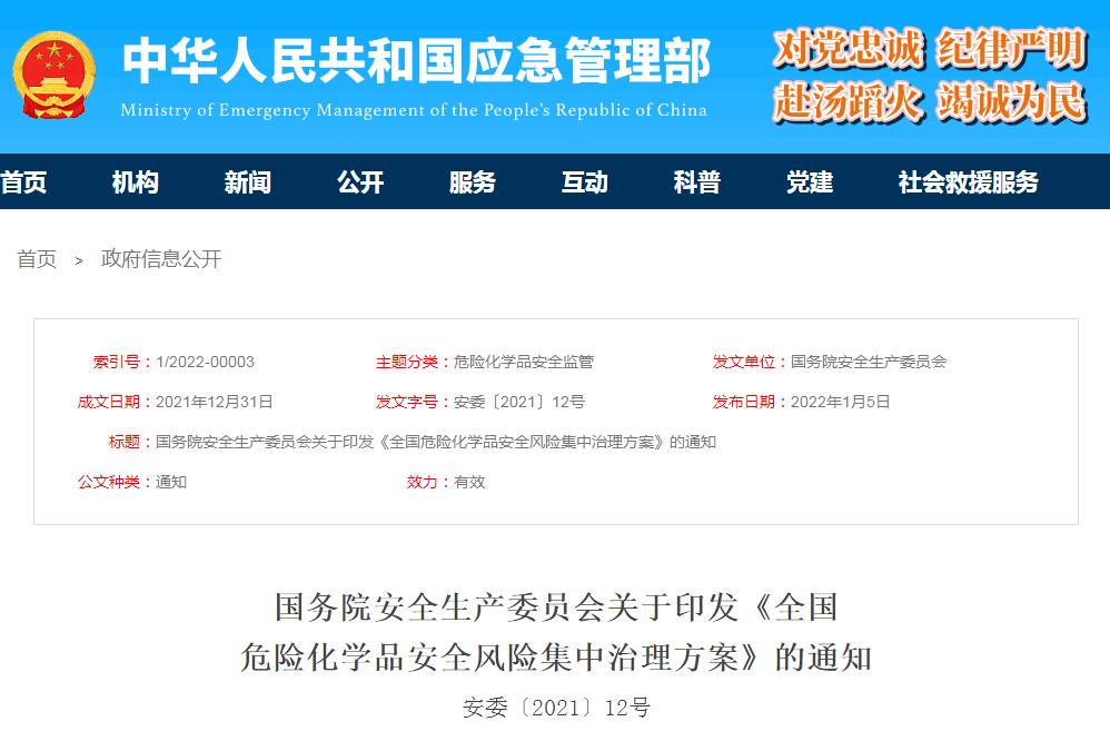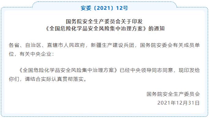 利用一年時間集中治理 2022年1月底前完成具體方案制定和動員部署,2022年11月底前完成治理任務(wù)、2023年1月底前完成總結(jié)驗收。利用一年時間集中治理,進一步推動各地區(qū)、各有關(guān)部門和單位樹牢安全發(fā)展理念,加大安全投入,壓實安全責任,堅持嚴格監(jiān)管執(zhí)法與強化信息技術(shù)支撐并重,完善危險化學品安全風險防范化解工作機制,務(wù)必做到重大風險隱患排查見底、防范治理措施落實到位,真正從根本上消除事故隱患、從根本上解決問題。