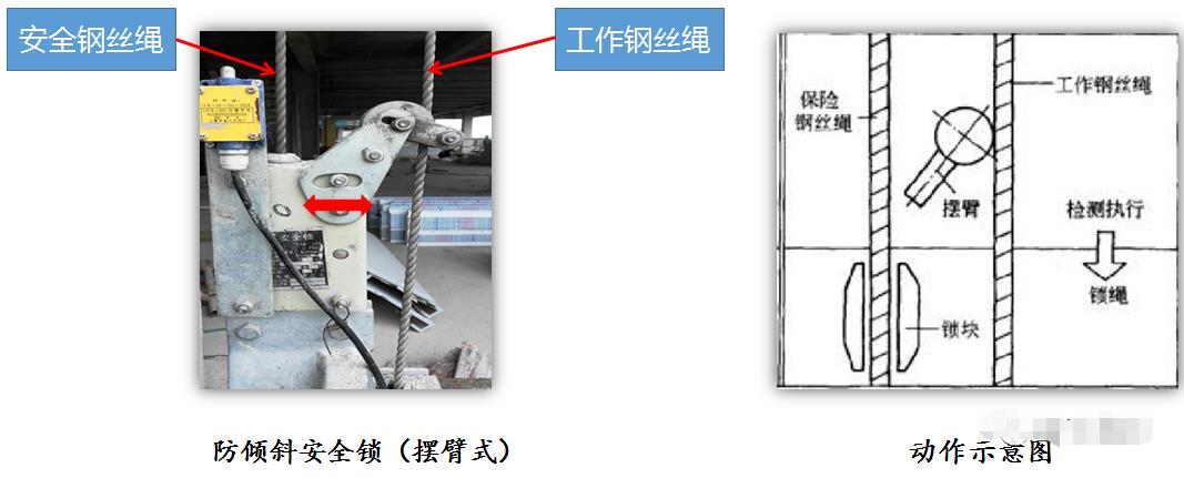 擺臂防傾式:具有鎖繩角度探測(cè)機(jī)構(gòu),當(dāng)?shù)趸@發(fā)生傾斜或工作繩斷裂、松弛時(shí),其鎖繩角度探測(cè)機(jī)構(gòu)即發(fā)生角度位置變化,帶動(dòng)執(zhí)行元件使鎖繩機(jī)構(gòu)動(dòng)作,將吊籃鎖住。